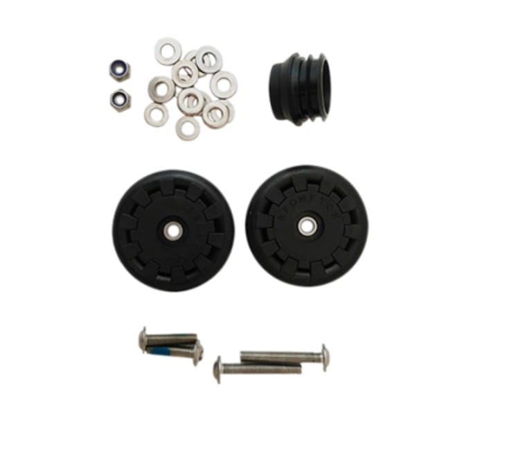 Zestaw zawiera dwa trwałe kółka montowane na bagażniku, komplet śrub i podkładek (6 mm), a także korek sztycy (seat post bung) – gumowy element zabezpieczający rower przed niekontrolowanym toczeniem się po złożeniu.